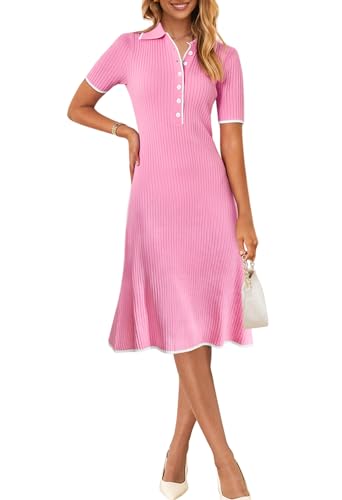 MEROKEETY Women's V Neck Ribbed Knit Midi Dress Short Sleeve Button Elegant Bodycon Sweater Dresses, Pink, Small
