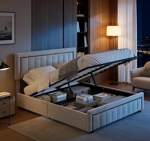 YYXLDYNB Dubbel vadderad säng, 160 x 200 cm, dubbel sängram med LED-belysning, säng för 2 personer med 4 förvaringslådor, LED-belysning, ribbotten, utan madrass, beige