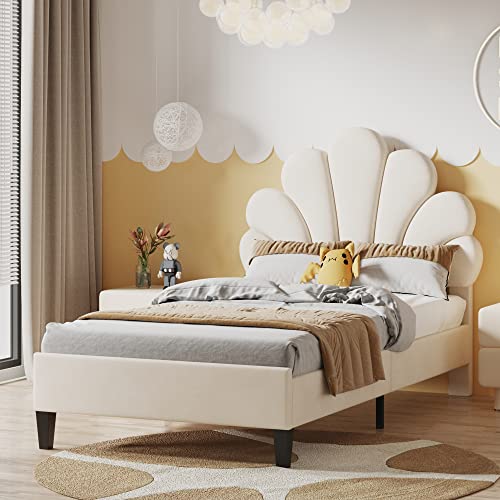 Aunvla Sängklädsel, barnsäng, 90 x 200 cm, sängram med sänggavel i blomform och ribbotten, tonårspojsäng i hudvänligt sammetstyg, gästsäng (färg: beige)