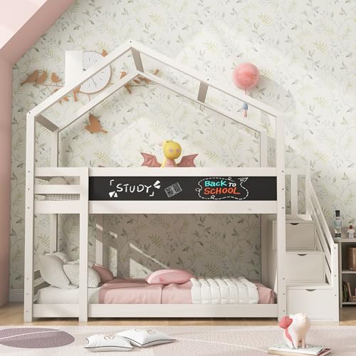 STARTOGOO Hus 90x200 pojkar och flickor barn i massivt trä konvertibel golvsäng med vit ribbotten, enkel