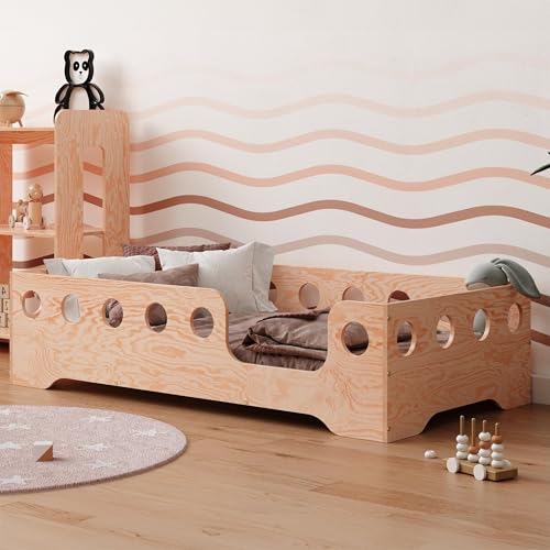 ecoMI Barnsäng inkl. fallskydd och ribbotten | 90 x 200 cm | natur | Golvsäng i Montessori | Säng av massivt trä, spjälsäng (natur, 90 x 200 cm)