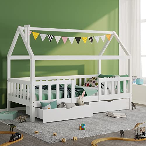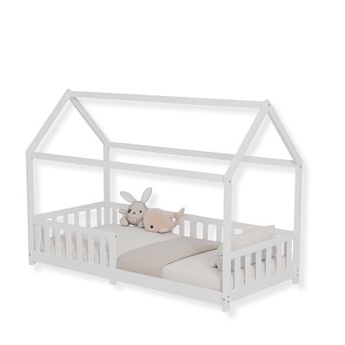 ecomi® Barnsäng Med Fallskydd Och Ribbotten, Hussäng - 90 x 200/80 x 160 i Vit/Natur För Barn (Vit, 90 x 200)