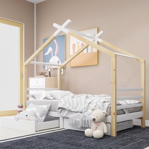 Aunvla Barnsäng, hussäng med lådor, massivt trä med ribbotten, furu, hussäng, barn och ungdomsrum, vit + träfärg (90 x 200 cm)