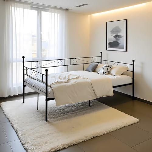 FetiNes Klassisk dagsäng, gästsäng, sängram, enkelsäng, metallsäng, sängsoffa med ribbotten för sovrum, vardagsrum, trädgård, lämplig för 90 x 200 cm madrass, svart