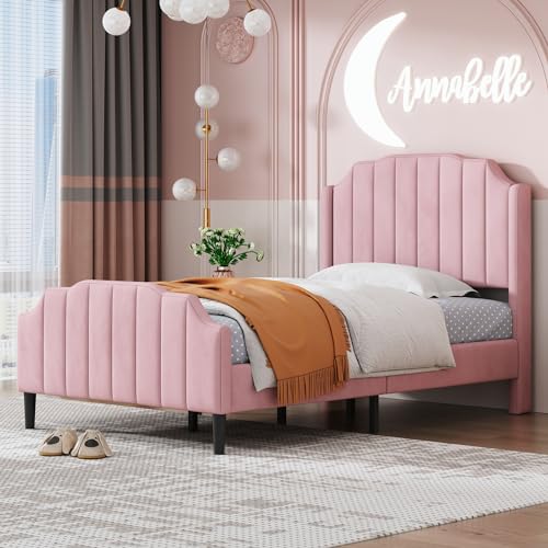 Aunvla Sängklädsel, 90 x 200 cm, barnsäng, sängram med sänggavel, fotdel och ribbotten, rosa, sammet, vadderad dubbelsäng, ungdomssäng, gästsäng