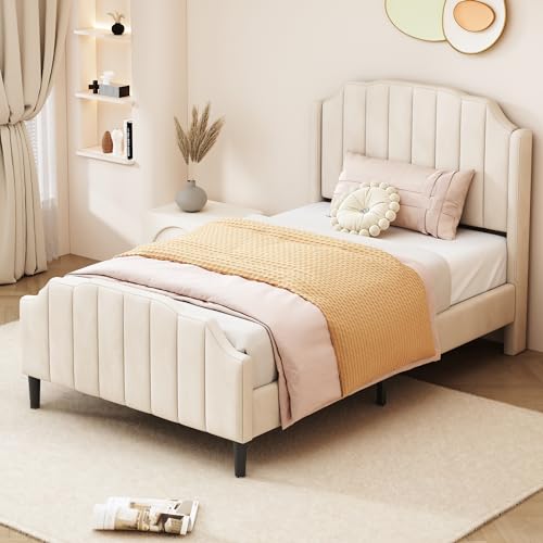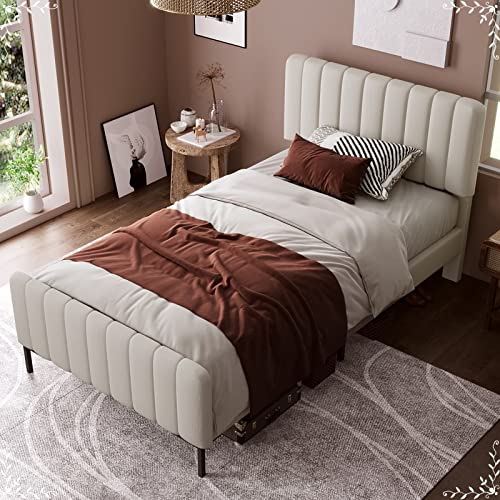 HAINEW Sängklädsel, 90 x 200 cm med sänggavel och fotdel, modern sammet, enkelsäng, sängram, vadderad ramsängram med ribbotten för vuxna, barn, ungdomar (beige)