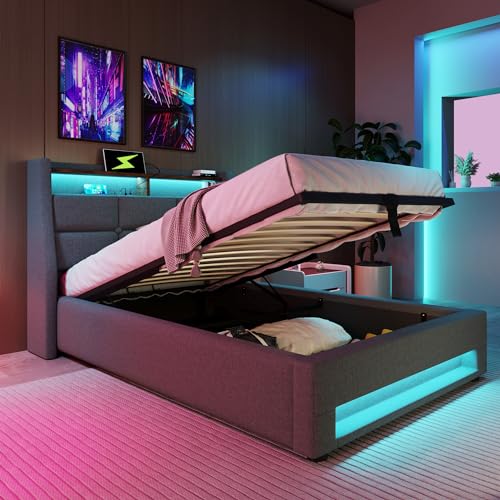 Aunvla Sängklädselsäng med laddning USB-laddningsfunktion, sänggavel och LED-belysning och 2 lådor, enkelsäng 90 x 200 cm förvaringssängar, sängram, ribbotten av trä, grå (utan madrass)