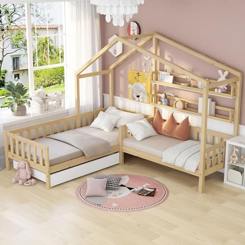 Aunvla Barnsäng, hussäng med lådor och hyllor, massivt trä med staket och ribbotten, L-struktur, natur (90 x 200 cm + 140 x 70 cm)