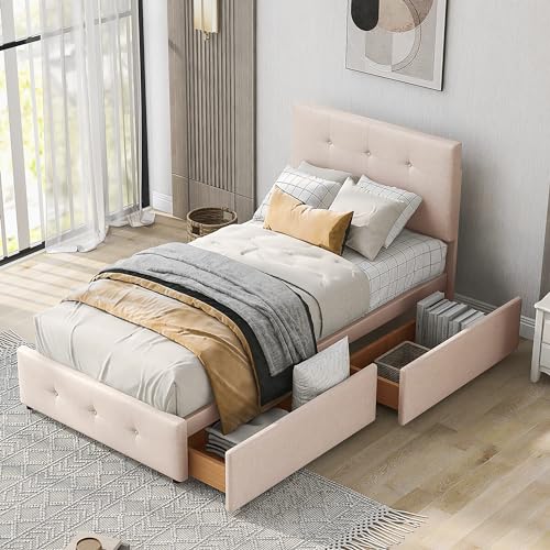 AMDXD Sängklädsel, enkelsäng, 90 x 200 cm, sängram med ribbotten och justerbar sänggavel, vadderad säng i beige, sängram, ungdomssäng, för sovrum, gästrum – linnematerial, 90x200cm