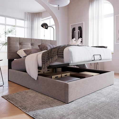 Säng 90 x 200 med ribbotten, bagagesäng 90 x 200 med förvaring och sänggavel, hydraulisk vadderad säng med ribbotten, enkelsäng, vadderad sängram, linne, beige (90 x 200 cm)