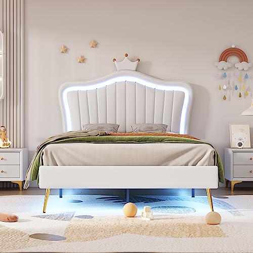 Aunvla Barnsäng, klädsel, 90 x 200 cm, sängram för flickor, vit krona, dubbelsängram av PU-läder med LED-lampor, ribbotten och ryggstöd (madrass ingår ej)