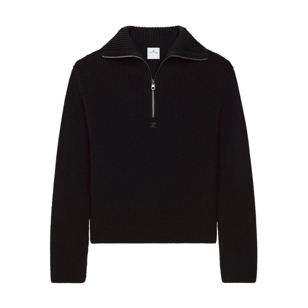 Courrèges, Stickade Tröjor , Dam, S, Svart Ribbstickad Halv Dragkedja Tröja