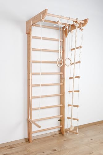 Ribbstol, barnrum, gym vägg, barn, småbarn | Klätterställning inomhus, gymnastikvägg av naturligt trä (210 cm) | Gymnastikringar barn med repstege, gunga | 100 % ECO | tillverkad i EU