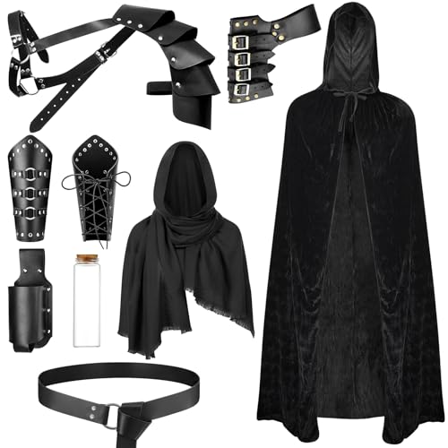 PLULON 9 st medeltida riddare kostym män mantel med huva sjal läderbälte en axel armering spänne armband svärd groda renässans retro tillbehör halloween kostym mörk svart