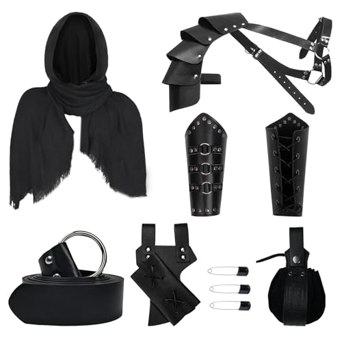 YRTBGD Medeltida riddare kostymaccessoarer set inkluderar medeltida läderbälte sjal retro huvudscarf läder steampunk axel armskydd bälte påse svärd groda för halloween cosplay (svart)