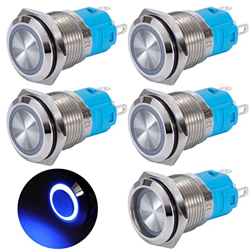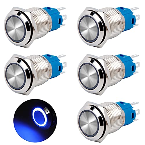 QIMEI-SHOP 5 st vattentäta 16 mm tryckknappsomkopplare i mässing med LED-ljus med blå ring för bil, båt, motorcykel, 5 stift,12V/24V 3A