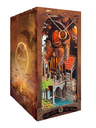 Cwood bokhinkskit med LED-ljus – 3D-träpussel bokkrok för bokhylla dekor – gör-det-själv dockhus kit – bokhylla dekor med dammskydd – magisk bokskrymn – Herren The Ring SQ-05