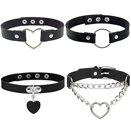 Conruich 4 stycken läder choker, dam hjärta hange choker, justerbar PU-läder halsband, metall ring halsband, svart punk rock gotisk krage med cirkel hjärta för kvinnor