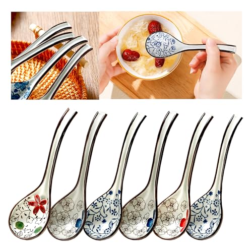 Asiatisk rissked, Xiuyer 6 st vit porslin soppsked för Ramen Pho Wonton Dumpling Miso spannmål restaurang kök sked, 6,5 tum keramisk soppskedar