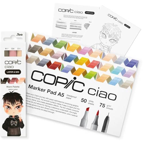 Copic Ciao LAYER & MIX startset varmt, märkpennor set med 3 olika färger, markörpapper och ritmall att pausa, inklusive inlärningsblad