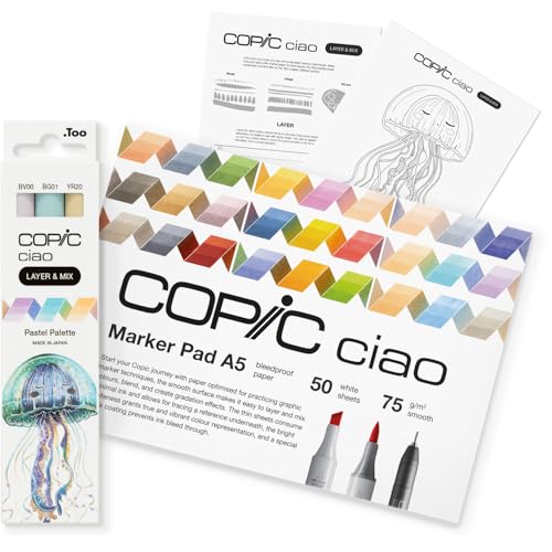 Copic Ciao LAYER & MIX startset, pastel, märkpennor set med 3 olika färger, markörpapper och ritmall att pausa, inklusive inlärningsblad