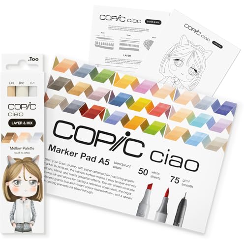 Copic Ciao LAYER & MIX Startset Mellow, märkpennorset med 3 olika färger, markörpapper och ritmall att pausa, inklusive inlärningsblad
