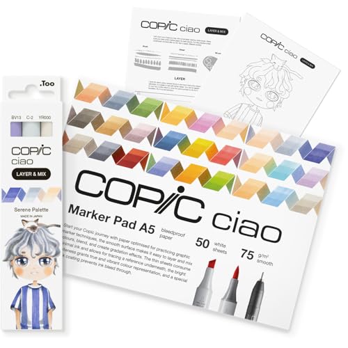 Copic Ciao LAYER & MIX Startset Serene, märkpennor set med 3 olika färger, markörpapper och ritmall att pausa, inklusive inlärningsblad