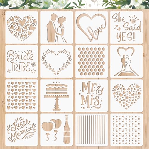 16 stycken målningsmallar, romantisk bröllopsdekoration stenciler, barn ritmallar plast återanvändbara, stenciler set för gör-det-själv hantverk målning på trä, sten, papper, tyg, vägg