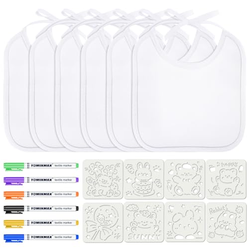 Aolso haklappar för målning – 6 vita haklappar med 6 textilpennor och 8 ritmallar, presenter till babyparty, vattentät (18 x 18 cm)