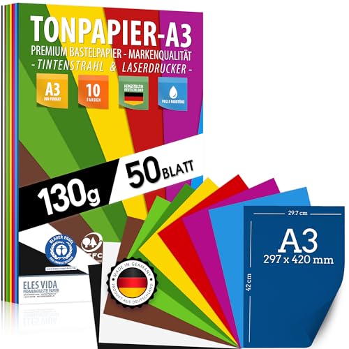 Förpackning med 50 ark färgat ritpapper - A3-storlek - 130 g - 10 färger - Starkt papper - Färgade ark för skolan, hobbyer - Ark för barn och pyssel - Tillbehör för