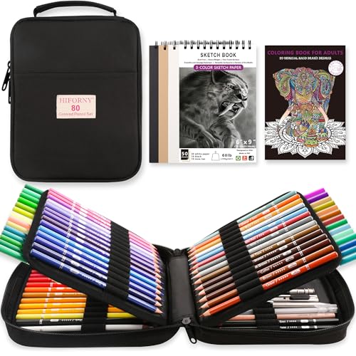 HIFORNY Set med 80 färgpennor för vuxna färgläggning – 72 färger färgpennor med extra, konstnärer mjuk kärna, ritpennor konst hantverk tillbehör för vuxna nybörjare, HF-CPT80-NY, Svart