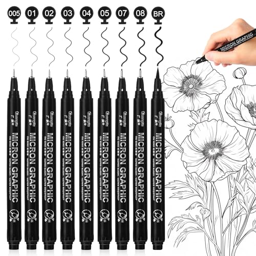 Surcotto Svarta Fineliner-pennor, pigmentpennor, fineliner, ritpennor, svarta pennor för konstskissning, ritning, teknisk ritning, illustration, serietidning - set med 9