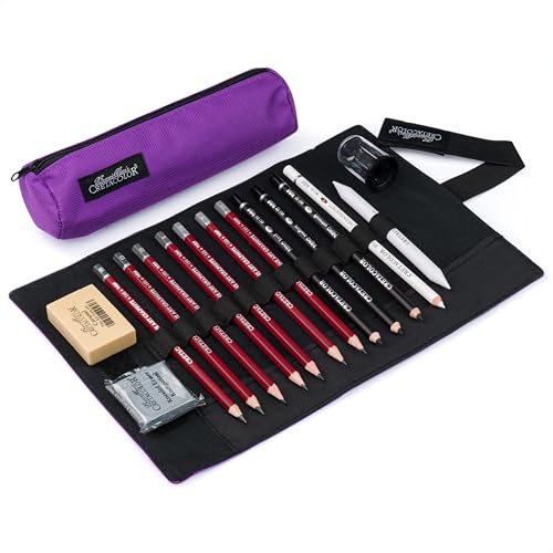 CRETACOLOR Rullfodral "nybörjaruppsättning" 16 stycken – ritpennor, grafit, nero och vitkritor – ritset för skisser och skuggning – konstnärstillbehör med tillbehör i lila fodral