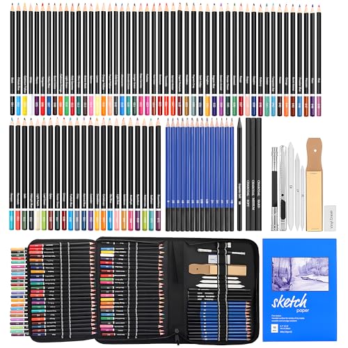 Shuttle Art Set med 103-pack skiss- och ritpennor, skisspennor med färgpennor, skissböcker, grafitpennor i robust blixtlåsfodral, konsttillbehör för konstnärer, nybörjare, vuxna