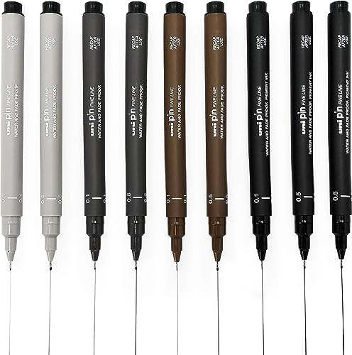 Uni Pin Fineliner ritpennor set med 9 st. svarta mörkgrå och sepia 0,1/0,5 mm
