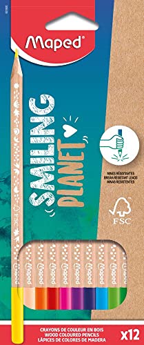 Maped Smiling Planet färgpennor i naturligt trä - 12 ritpennor för barn - ergonomisk triangelfärgpenna - påse med 12 FSC-certifierade träpennor