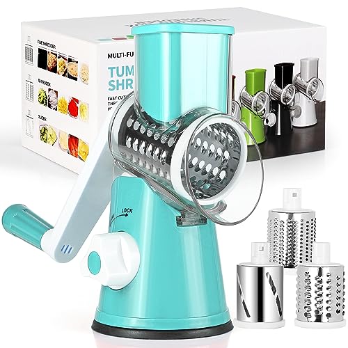 Diealles Shine Ostrivjärn med vev, rivjärn för grönsaker med 3 utbytbara trumblad, manuell trumma rivjärn, grönsaksskärare, perfekt för gurkor, ost och nötter, morötter etc (blå)