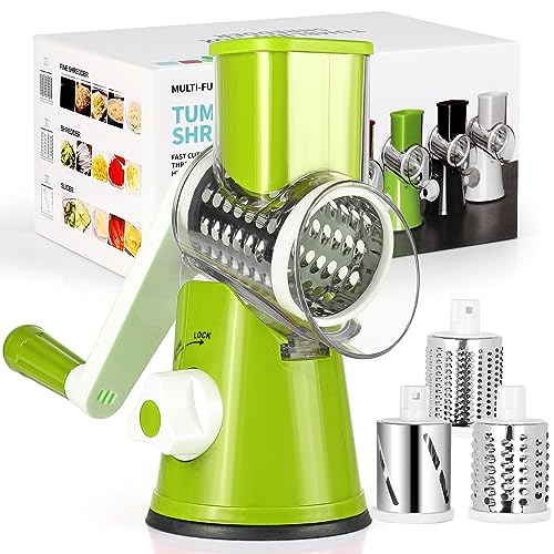 Diealles Shine Ostrivjärn med vev, rivjärn för grönsaker med 3 utbytbara trumblad, manuell trumma rivjärn, grönsaksskärare, perfekt för gurkor, ost och nötter, morötter etc. (grön)