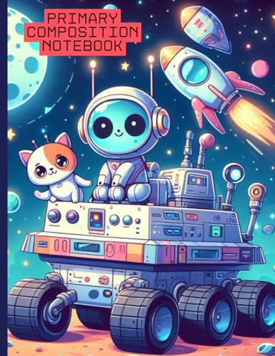 Space Explorer Primary Composition Notebook: Cute Robot and Cat on Lunar Rover | Wide Ruled Writing Journal with Drawing Space | Fun Space Adventure ... for Kids | Ages 4–8 | 8.5 x 11 in, 120 Pages