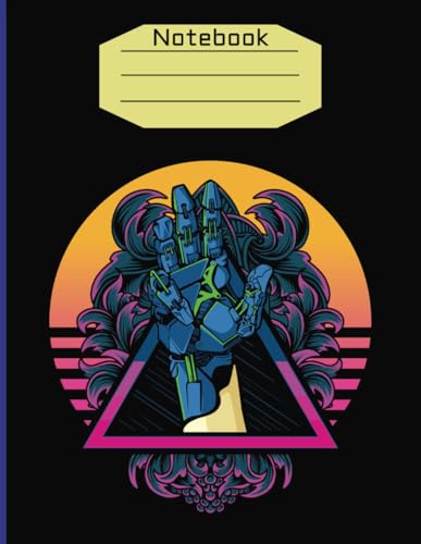 Composition Notebook Softcover : Rise of the Cyborg Sun: Futuristic Retro Robot Hand Emerging from Pyramid – Sunrise over Black Background – 120 Pages, College Ruled, Matte , 8.5 x 11 in
