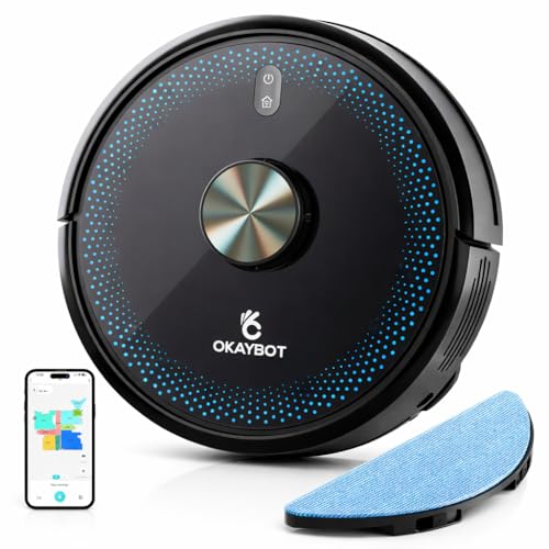 OKAYBOT V1 Robotdammsugare med Mopp, Laser Navigationssystem (LDS), 4000Pa Stark Sugkraft, Automatisk Carpet Boost, WiFi/App/Alexa-kompatibel, Städrobot för Husdjurshår och Hårda Golv