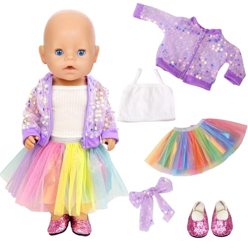 6 lila paljetter dockkläder för 35–45 cm babydockor, dockklänning tillbehör med väst rock tutu hårsmycke med rosett sko för 14–18 tum nyfödda babydockor barn födelsedag