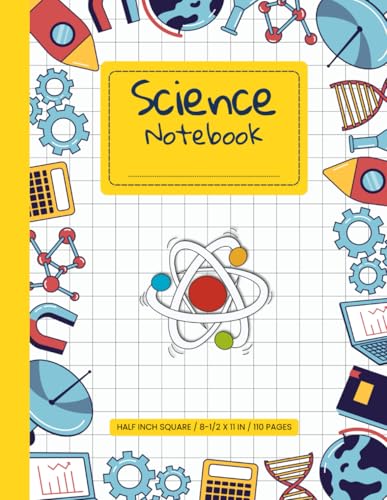Science Notebook 1/2 Inch Squares: Quad Ruled 2x2 Grid Science Notebook – Features Rocket, DNA, Atom, Earth Globe, Satellite & School Icons