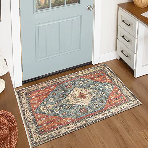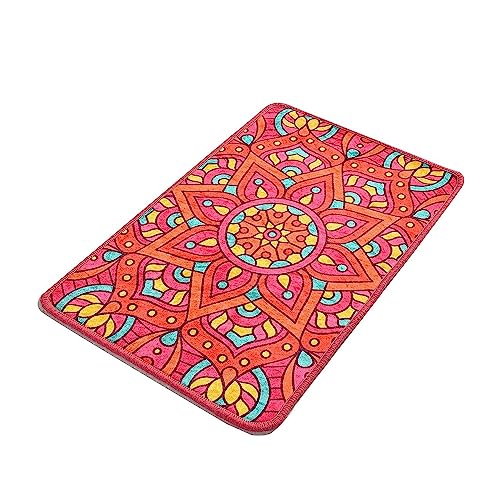 KIMODE Bohemisk dörrmatta för inomhusbruk, 60 x 90 cm, kort lugg, tvättbar, av distressed konstgjord ull, halkfri golvmatta, mjuk badrumsmatta, för hall, sovrum, kök och entré, röd