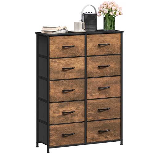 DWVO Byrå i tyg, byrå i tyg sovrum skåp med 10 lådor, byrå för sovrum, vardagsrum med handtag, trätopp och robust stålram, rustik brun