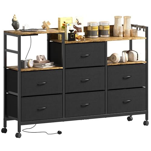 Lutown-Teen byrå sovrum byrå på hjul, 2 USB-portar, 2 AC-uttag, skåp för sovrum med 7 tyglådor och öppen hylla, förvaringsenheter för vardagsrum, trätopp, rustik brun