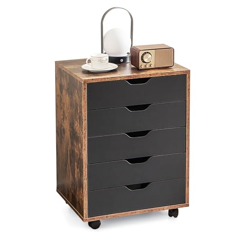 KOMFOTTEU Byrå med 5 lådor, mobil förvaringslåda med 4 universella hjul, vertikal pärm i trä, för vardagsrum, sovrum, kontor, arbetsrum, 49 x 42 x 66 cm (rustik brun)