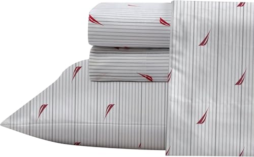 Nautica - Queen lakanset bomull percale sängkläder, krispigt och svalt, lätt och andningsbart (båttryck röd, drottning)