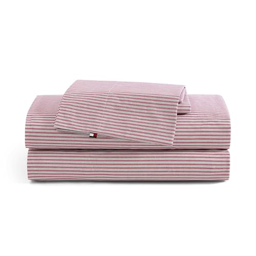 Tommy Hilfiger – lakanset, bomull perkale sängkläder med matchande örngott, krispigt och svalt, premium kvalitet hemtillbehör (högland tickande randigt röd, drottning)