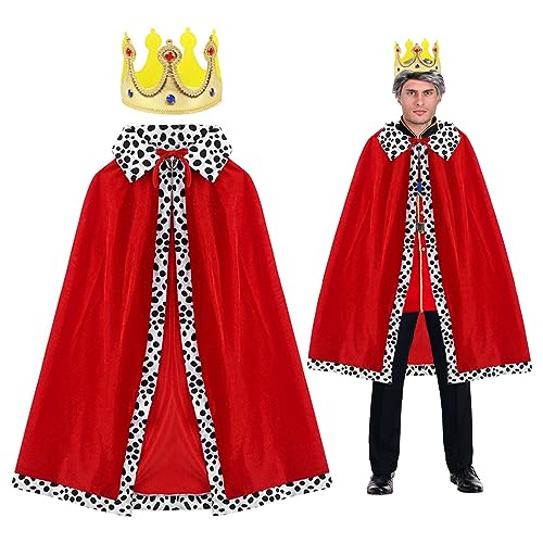 TSHAOUN Kostymset för vuxna, kung, drottning, 2 st set, kungsrock, drottning, rock med krona, röd mantel, kappa för kung, drottning, rollspel, halloween, kostym, scenframträdande, 120 cm längd för män